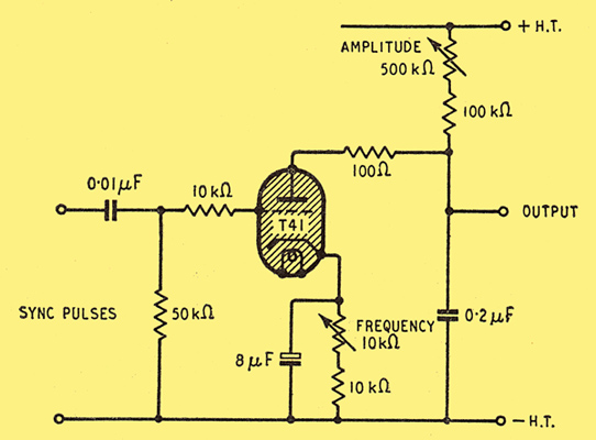 A typical thyratron TV timebase circuit of the early 1950s.The classic envelope is 32 mm in diameter and, excluding the MO base pins, is 72 mm tall.References: Data-sheet, 1040 & 1043. Type T41 was first introduced in 1940. See also 1940 adverts. |