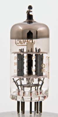 The thin glass tube envelope is 20 mm in diameter and, excluding the B9A base pins, is 48 mm tall.