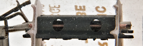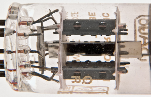 A close-up of a single triode showing the copper grid support rods and the grid winding.