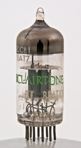 The ECC81 was designed for RF voltage amplifier use. The exhibit is labeled Clairtone and Great Britain. The mark made by the machinery that closed off the glass tube is a match for the Mullard ECC81.