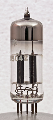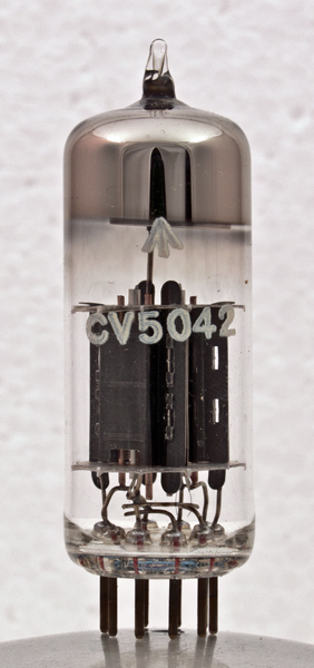 The CV5042 double triode is pin compatible with the ECC81, ECC82 and ECC83 series from Mullard but has slightly different characteristics. Brimar make the commercial equivalent 12BH7 and give the design use as TV frame oscillator and frame output. The CV number suggests a rugged or reliable version.
