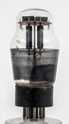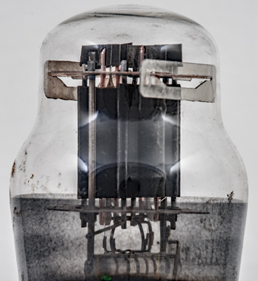 The side mica sheets at the top fit tightly into the glass and hold the electrodes rigid. The control grid is wound on copper rods with heat radiating fins at the top. The cathode tube is shaped to a small diameter for securing in the top mica.