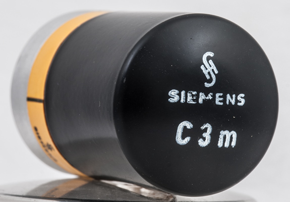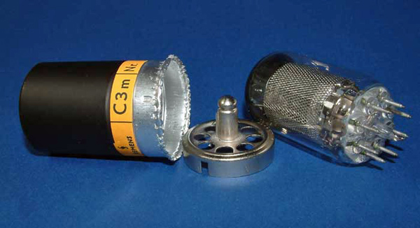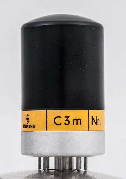 The C3m is a general purpose pentode with a 125 mA heater requirement for series heater chains. The construction is all glass with a built-in aluminium screening can.