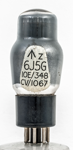 The CV1067 is a single triode is housed within a glass envelope. The electrode assembly is formed on a glass pinch in the traditional style. The anode plates are formed to leave an oval cavity for the grid and cathode.The prototype for the CV specification was the M-OV L63 but clearly the 6J5G is a direct equivalent and this exhibit even carries the UK old stores codes. Prior to the CV register this specification was known as the VR67 by the RAF and POVT154 by the GPO for telephone service.