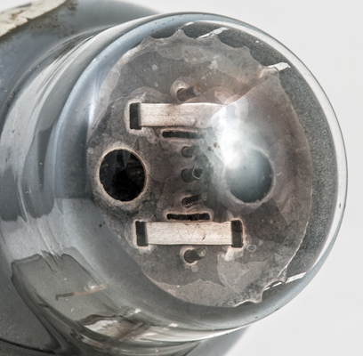 The top of the glass reveals a round cathode and supports that suggest a close wound control grid.The classic envelope is 38 mm in maximum diameter and excluding the IO base pins the valve is 83 mm long.References: Data-sheet, 1040 & 1043. |