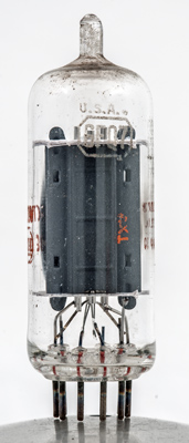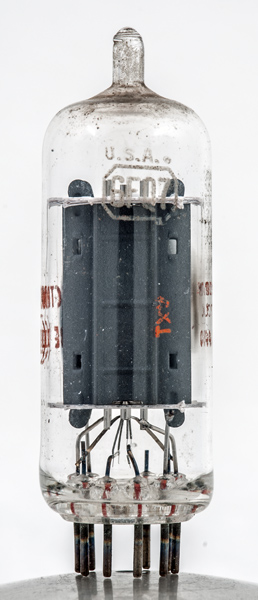 The thin glass tube envelope is 20 mm in diameter, and excluding the B9A base pins is 59 mm tall.