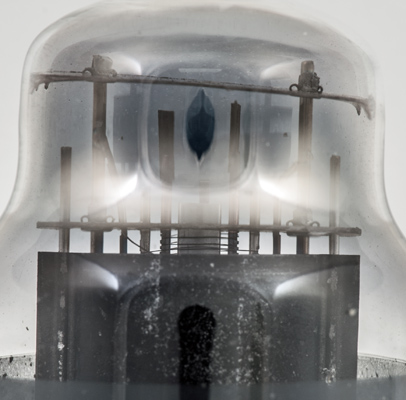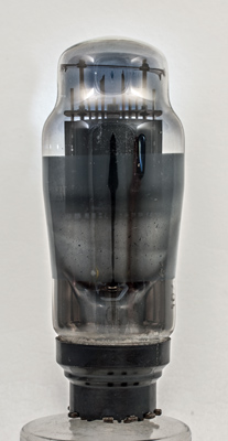 The anode is oval in shape. The control grid is fitted with radiating fins at the top of the supports. The suppressor grid supports extend up to a secondary mica sheet that fits tight in the top of the envelope and holds the electrodes firm.