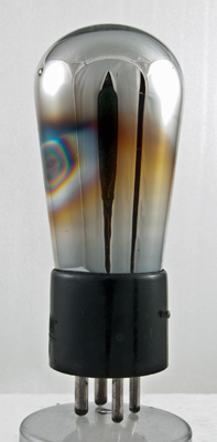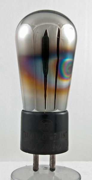 The RCA UX201A was introduced in August 1925. The 201A triode dates to 1922 when it was fitted with the then standard UV base. The 201A was the electrode structure of the 1920 201 but fitted with a thoriated tungsten filament in place of the bright emitter pure tungsten of the 201. The UV base has a locating pin that guides the valve into the base before the locking twist into the bayonet base. In 1925 the UX base was introduced by RCA with the UX201A retained the locating pip so that the valve could be used in UV bases. Interestingly the UX201A data-sheet gives the grid and anode connections reversed from the UV201A.