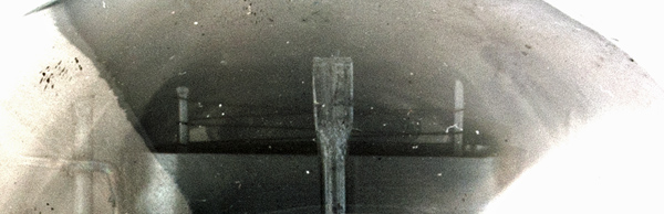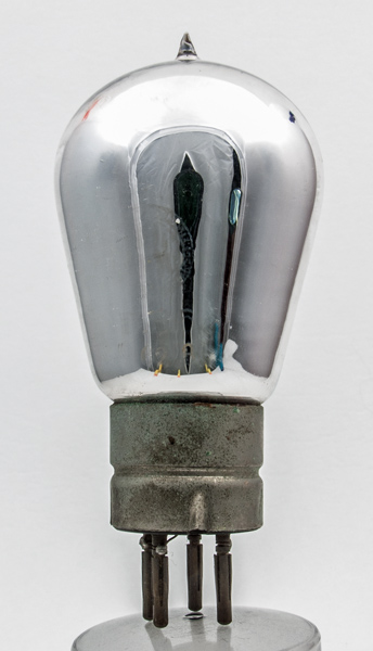 The central strut carries the tension spring to hold the top of the single inverted V filament. The grid winding is also visible through the silver gettering.
