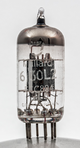 The ECC804 Mullard Type designation is printed smaller than the 6/30L2 indicating that the 6/30L2 was an established design also made by Mullard. The valve is a general purpose double triode with a screen between the sections. The main application is in television receivers.