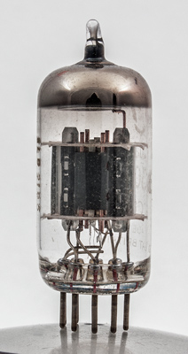 The thin glass tube envelope is 20 mm in diameter, and excluding the B9A base pins is 48 mm tall.