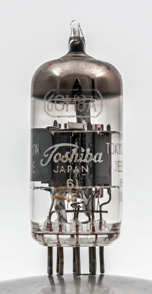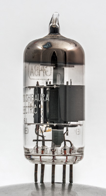 The triode is mounted at right angles to the grid axis of the pentode.The thin glass tube envelope is 20 mm in diameter, and excluding the B9A base pins is 50 mm tall.Reference: Data-sheet. Type 6GH8A was first introduced in 1961. See also 1961 adverts. |