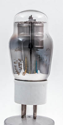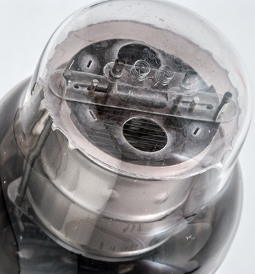 Through the hole in the top mica the grid wire and one filament can clearly be seen.