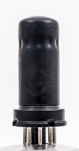 The 6P9 is the English name for this Soviet metal output beam tetrode. The Type on the envelope is in Cyrillic 6П9. The 6P9 is describes as being designed for power amplification in broadband amplifiers. It is vibration and impact resistant and has a guaranteed service life of 2,000 hours. This exhibit is unused.