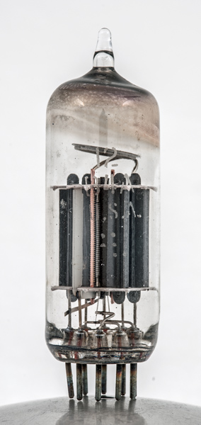 The thin glass tube envelope is 20 mm in diameter, and excluding the B9A base pins is 58 mm tall.