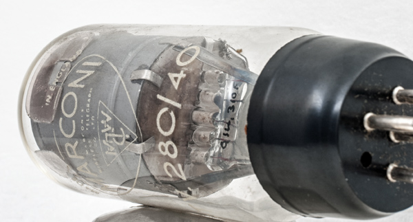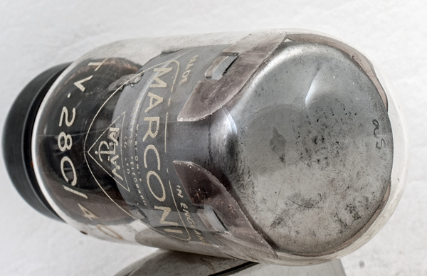 Inside the dome the outer cylinder is closed at one end and held in place within the glass by the mica sheets.The wide glass tube envelope is 46 mm in diameter and, excluding the B5 base pins, is 123 mm tall.References: Data-sheet & R J Sutherland. Type STV280/40 was first introduced in 1936. See also 1936 adverts. |