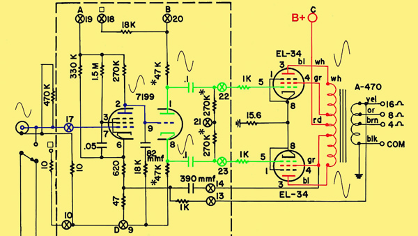 Circuit of of one channel of the Dynaco ST-70 stereo amplifier.