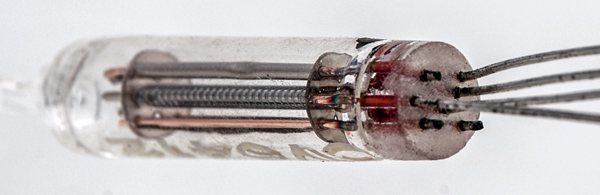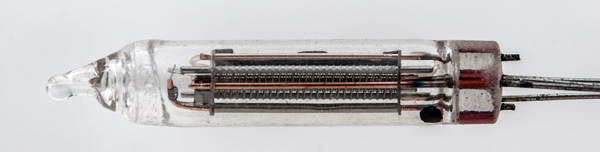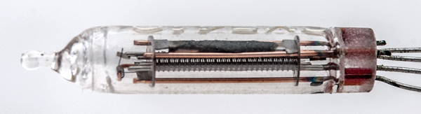 The anode is a wire wound grid coated with a phosphor that gives a bright blue-green glow. The intensity of the display is proportional to the anode current.