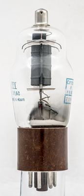 The anode side view: all three wire grids can be seen above the lower mica. The copper control grid supports are topped by heat singing fins.