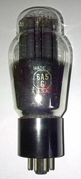 The 6A5G is an audio output triode. It is indirectly heated and with a load of 2,500Ω will deliver 3.75 Watts at 5% total harmonic distortion. The construction is as two units connected in parallel internally.