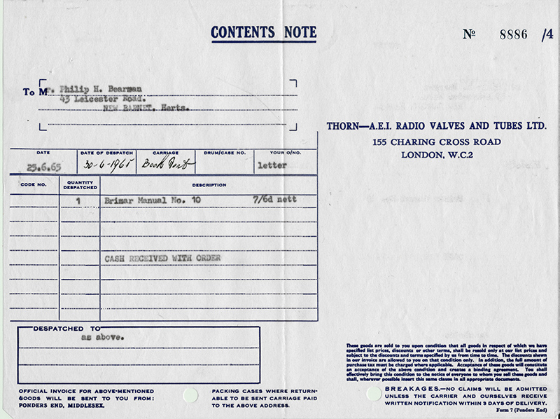 Here is the original invoice for this manual. The purchaser, Philip H Bearman, originally rented out TVs but found selling valves and CRTs more lucrative. He even branded and boxed his own valves under the logo PHB.