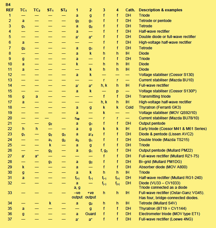 B4 | Standard British four-pin base. Early types had metal shell and later types were moulded. Used on the majority of early low-power valves. |