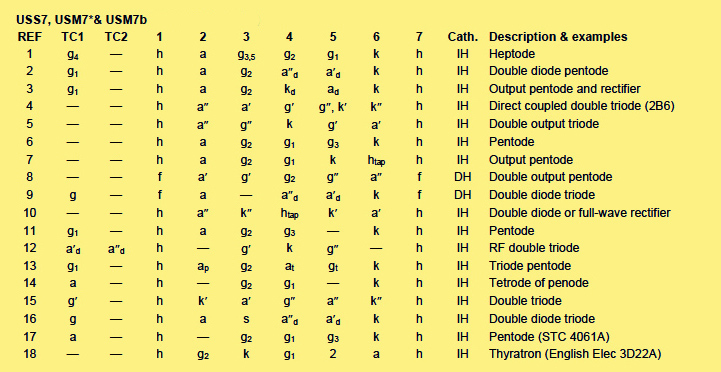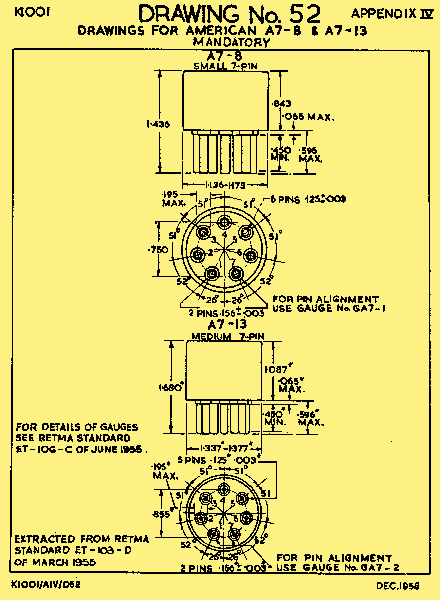 This seven pin base originated in America in two forms that are slightly different as the image below makes clear. The smaller pitch circle is the earlier design and is known as the Small 7-pin and A7-8 drawing also as USS7. The base dimension from pin tip to top of base is 1.436 inches (36.47 mm). The later version with a larger pitch circle but the same pin diameters is known as the Medium 7-pin, drawing A7-13 and UX7 and here the pin tip to top of base skirt is 1.68 inches (42.67 mm). The UX7 is also known as the USM7.