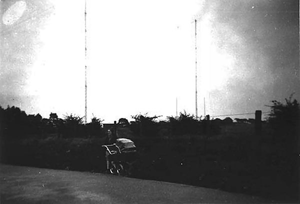 'Enid and I went out for a walk past the station. This snap shows Enid and baby in pram with masts in the distance. 500 feet high. Two small masts for experimental purposes.'