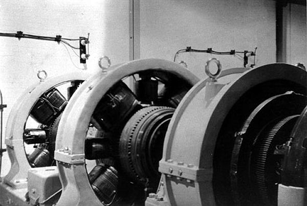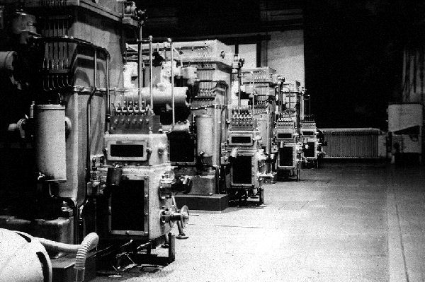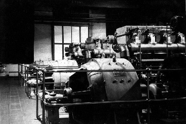 The four diesel engines which generate our own power. Six cylinder 630 HP. You can see in (the) far engine the six tubes which convey the oil to each cylinder from the compressor (2,000lb per sq. in.)