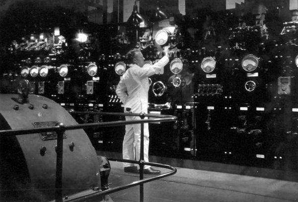 Engine room switchboard or part of it. Exposure time 2 minutes in electric light. I set up camera and ran to board for two minutes and then ran back and switched off the shutter. The camera not quick enough to record my movement but OK on long pose.