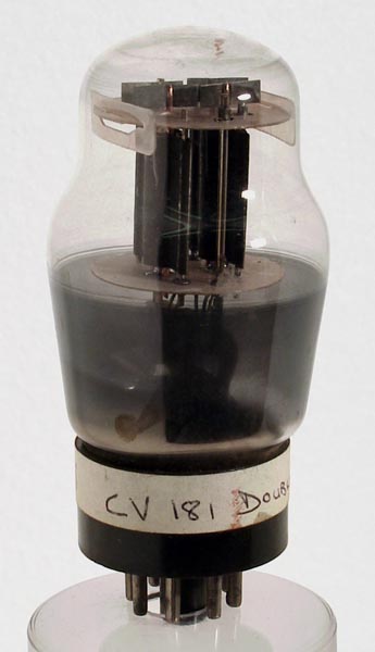 The CV181 double triode is of the low impedance type and takes a large heater power for such a valve. The design is a modified NR73. The commercial equivalent is the ECC32.The double triode is found in amplifiers and instrumentation.This valve was popular in the WWII era, and is of pinch construction within a glass envelope.The classic envelope is 37 mm in diameter and, excluding the IO base pins, is 88 mm tall.References: Data-sheet & 1043. |