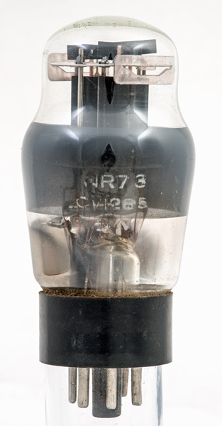 The NR73 was a very popular and useful double triode badged here as a Navy Receiving valve. It was later given the CV reference of CV1285 that also appears on the glass of this exhibit. A modified NR73 became the CV181 and commercially the ECC32.