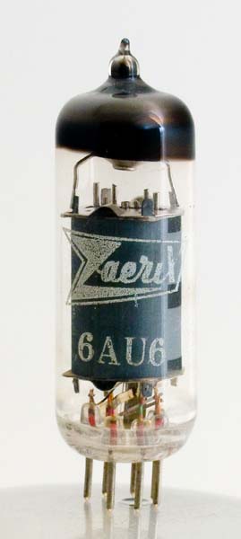 The 6AU6 is an RF pentode for use up to 50 MHz.The thin glass tube envelope is 18 mm in diameter and excluding the B7G base pins the valve is 53 mm tall.References: Data-sheet & 1040. Type 6AU6 was first introduced in 1946. See also 1946 adverts. |